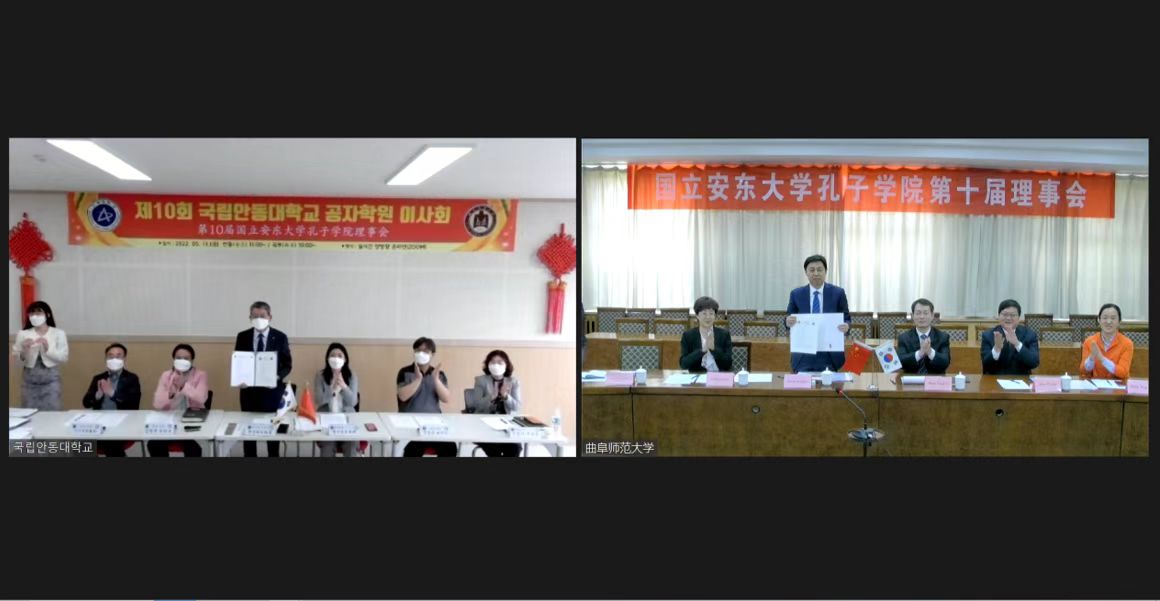 曲阜师大新闻中心讯 5月13日,华体会官方网页版_华体会(中国)与韩国国立安东大学以视频方式召开了国立安东大学孔子学院第十届理事会。曲阜师大校长张洪海,国立安东大学校长权纯泰出席会议,安东孔院韩方院长金炳圭、中方院长王秀卿以及中外方理事会成员、孔子学院相关工作人员参加了会议。