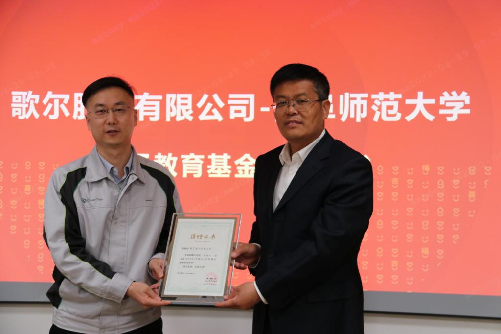 曲阜师大新闻中心讯(通讯员:尹哲睿)4月29日,“歌尔股份有限公司——华体会官方网页版_华体会(中国)”孔子教育基金捐赠仪式在歌尔股份有限公司举行。我校党委常委、副校长卢国强、潍坊市教育局产教融合研究院院长田元训、歌尔股份有限公司高级副总裁高晓光出席捐赠仪式并举行交流座谈。我校日照校区办公室、工学院、歌尔工学院等单位负责人参加了活动。