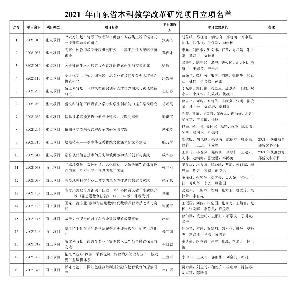 曲阜师大新闻中心讯(通讯员:孙新慧)近日,山东省教育厅公布了2021年山东省教学改革研究项目立项名单,我校此次共推荐申报17项本科教学改革研究项目,全部获得立项。另外,我校被省教育厅推荐并获批教育部“新文科”项目的2个项目(全省仅20项)认定为省级重点项目。本次山东省教学改革研究项目我校总计立项19项,其中10项重点项目和9项面上项目,立项总数和获批重点项目数量位居省属高校前列。
