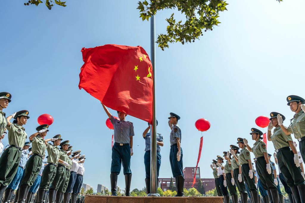 “我和我的祖国,一刻也不能分割……”典礼前,我校大学生艺术团带来了精彩的表演,同学们手持鲜艳的五星红旗,在壮丽的歌声中涵养着家国情怀。