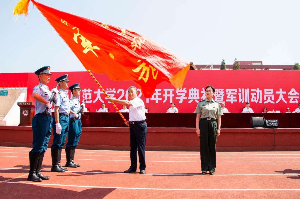 党委书记戚万学在曲阜校区为军训旅授旗