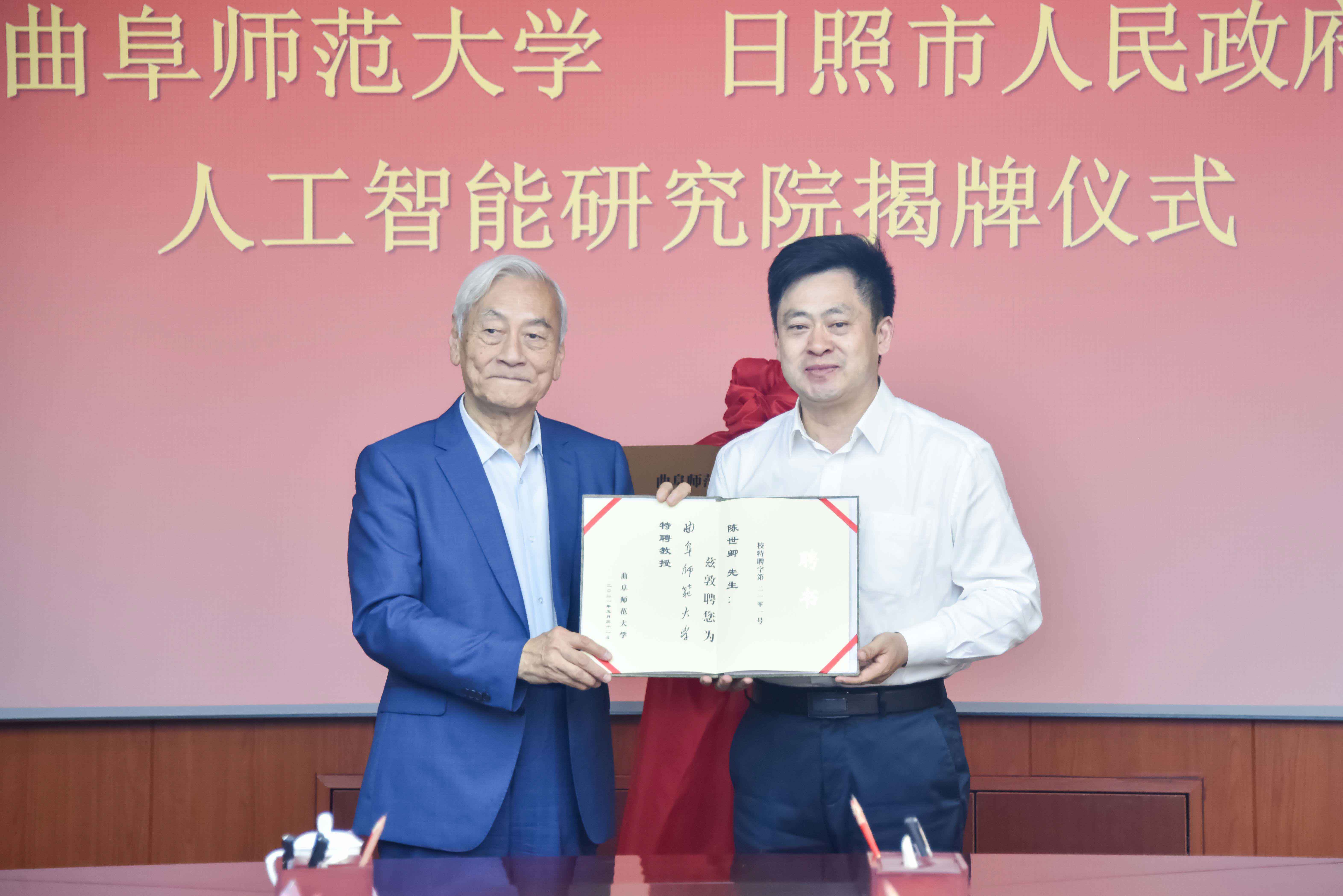 曲阜师大新闻中心讯(记者:李文振 摄影:李文振) 6月1日上午,由华体会官方网页版_华体会(中国)与日照市政府共建的人工智能研究院揭牌成立,美国国家工程院院士、美国艺术与科学院院士陈世卿教授加盟担任研究院院长,曲阜师大党委书记戚万学与陈世卿院士共同为研究院揭牌,戚万学同时为陈世卿院士颁发了特聘教授聘书。