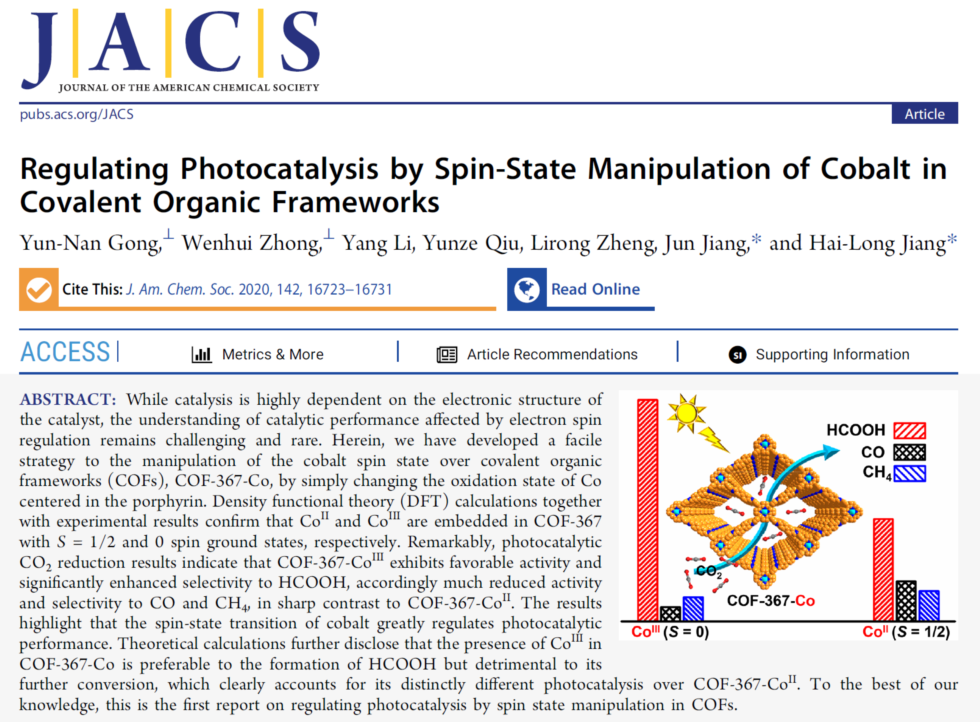 此外,2020年9月,钟文辉副教授与中国科学技术大学江俊教授合作的另一篇题为“Regulating Photocatalysis by Spin-State Manipulation of Cobalt in Covalent Organic Frameworks” (doi:10.1021/jacs.0c07206),也发表在《美国化学会志》(Journal of the American Chemical Society)上,华体会官方网页版_华体会(中国)为共同署名单位,钟文辉副教授为该论文的共同第一作者。