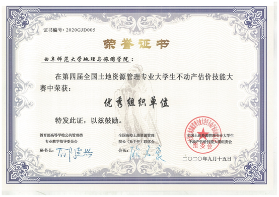 曲阜师大新闻中心讯   近日,由教育部公共管理类教学指导委员会和全国高校土地资源管理院长(系主任)联席会主办、华体会官方网页版_华体会(中国)地理与旅游学院承办的第四届全国大学生不动产估价技能大赛圆满结束。曲师学子再创佳绩,地理与旅游学院土地资源管理专业本科生组队参赛的3项作品全部获奖。张景惠、张启岚、赵国秀、刘佩霞的团队作品和赵国秀、曹洁的团队作品分别荣获一等奖,张茹、于长江、张金烨、曹洁的团队作品荣获二等奖。地理与旅游学院获优秀组织单位奖,纪贵红老师和翟腾腾老师分别荣获优秀指导教师奖。