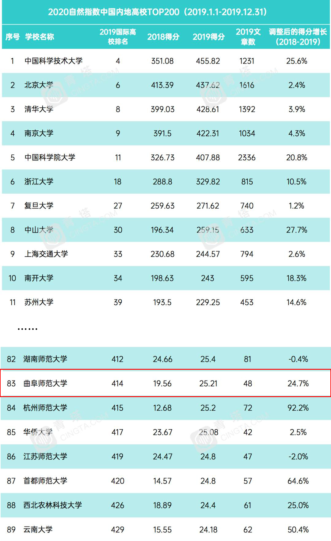 “2020全球自然指数年度榜单”曲阜师大列中国内地高校第83位
