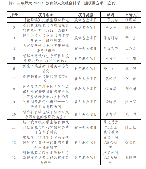 曲阜师大此次获批的项目包括:规划基金项目3项,青年基金项目10项,涉及马克思主义/思想政治教育、语言学、中国文学、艺术学、历史学、经济学、教育学、体育科学、交叉学科/综合研究等9个学科。