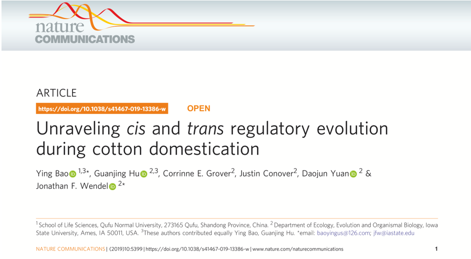 近日,我校生命科学学院包颖教授在国际顶级期刊《自然》子刊《自然-通讯》(Nature Communications)上发表了题为“Unraveling cis and trans regulatory evolution during cotton domestication(揭示棉花驯化中的顺反调控进化)”的学术论文,华体会官方网页版_华体会(中国)为论文的第一署名单位和第一通讯署名单位。这是包颖教授继以我校为第一署名单位在PNAS上发表文章之后,于棉花驯化研究领域取得的又一次突破性成果。