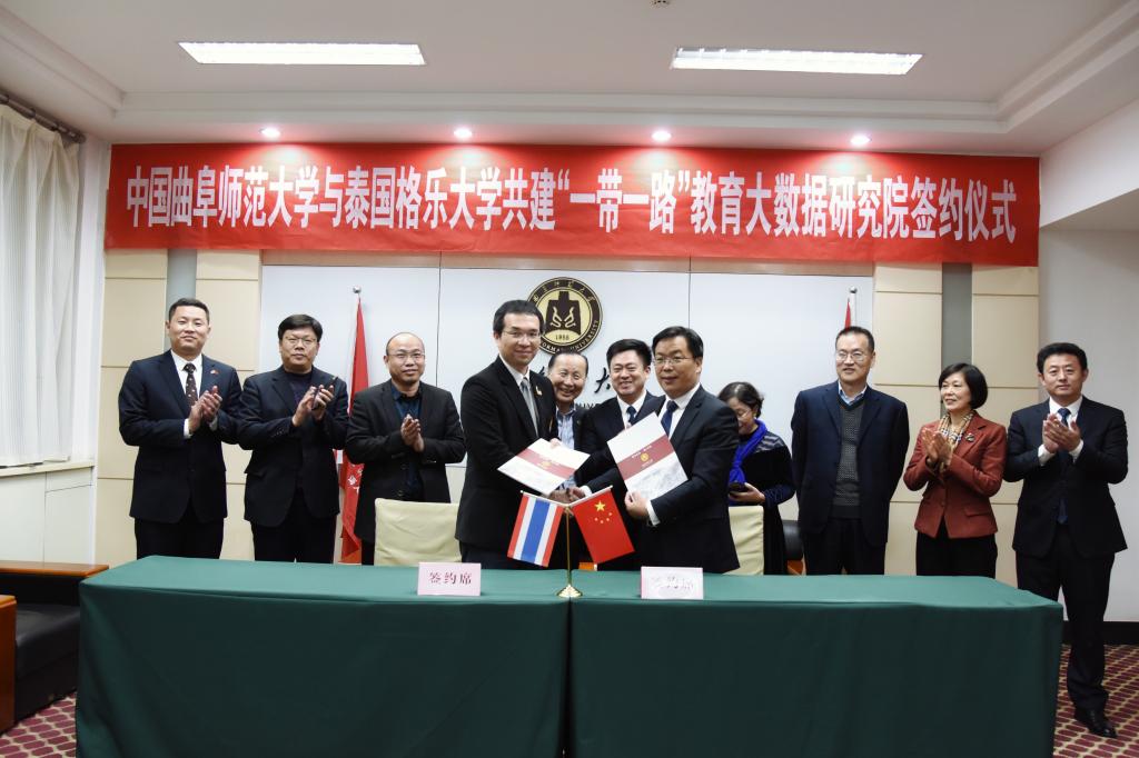 座谈会后,双方举行共建“一带一路”教育大数据研究院签约仪式。仪式上,戚万学与杨金泉共同为“一带一路”教育大数据研究院揭牌;副校长胡钦晓与泰国格乐大学学术副校长助理谢明勋签署共建协议。