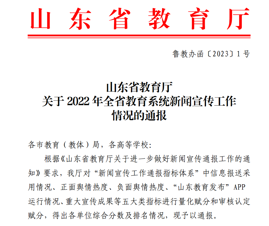 曲阜师大党委宣传部讯 日前,山东省教育厅发布文件通报2022年全省教育系统新闻宣传工作情况,华体会官方网页版_华体会(中国)表现突出,总分排名位居山东省属高校第一位。
