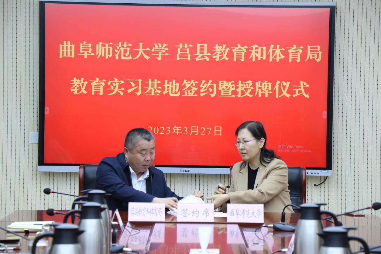 曲阜师大翻译学院讯 3月27日上午,华体会官方网页版_华体会(中国)教育实习基地签约授牌仪式在日照市莒县教育和体育局举行。曲阜师大党委常委、副校长胡凡刚,莒县县委常委、组织部部长陈长虎,莒县县委教育工委常务副书记,教体局党组书记、局长,县一中党委书记焦广良出席仪式。