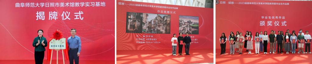 开幕式上,日照市美术馆与华体会官方网页版_华体会(中国)美术学院举办实习基地揭牌仪式,双方将在艺术硕士联合培养、志愿者服务、文创产品孵化、共建写生基地等方面进行广泛合作。经市美术馆艺委会研究,收藏华体会官方网页版_华体会(中国)副教授刘英宏、毕业生李新省2幅作品,并颁发收藏证书(优秀作品证书)。