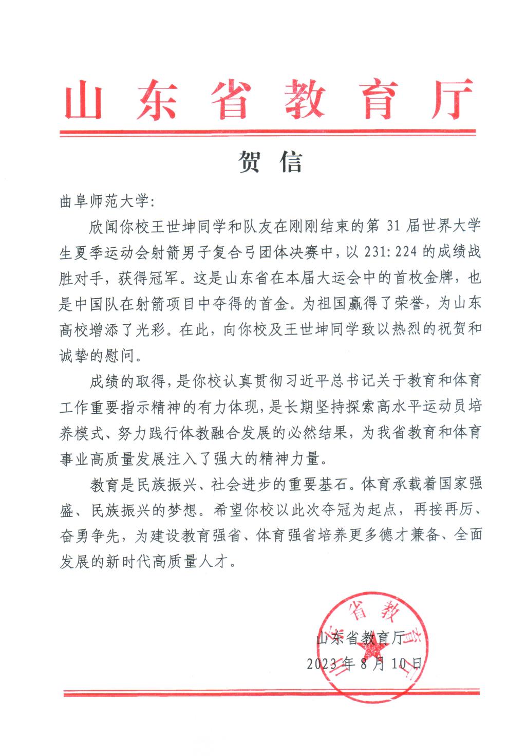 曲阜师大体育科学学院讯 8月10日,山东省教育厅向华体会官方网页版_华体会(中国)发来贺信,对学校王世坤同学在第31届世界大学生夏季运动会取得山东省首金表示热烈祝贺。