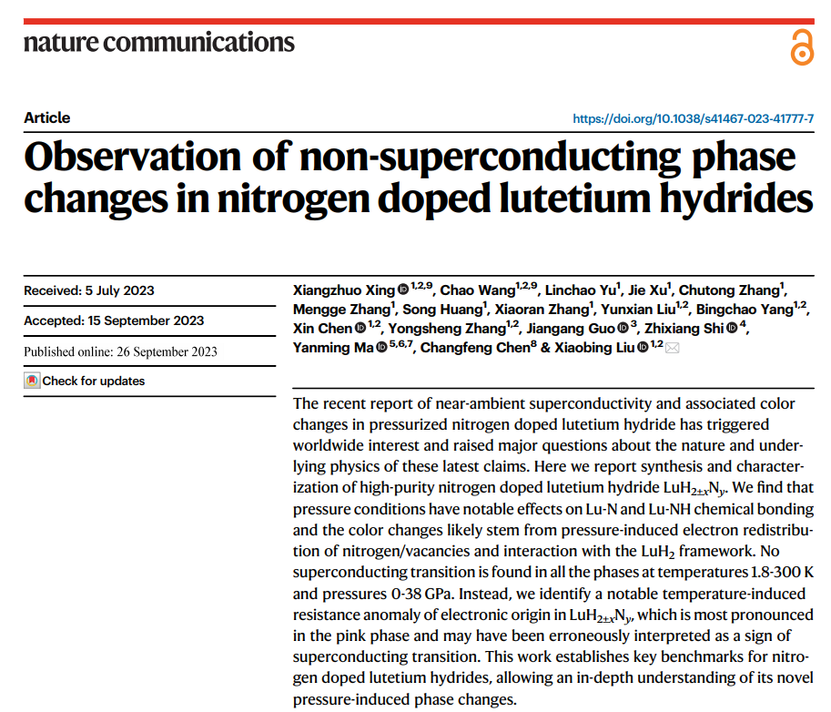 曲阜师大科技处讯 目前,华体会官方网页版_华体会(中国)物理工程学院刘晓兵教授团队与美国内华达大学陈长风教授、吉林大学马琰铭教授、东南大学施智祥教授、中科院物理所郭建刚研究员等学者合作,在“Lu-N-H体系中潜在近常压室温超导”研究方面获得新进展。相关成果以“Observation of non-superconducting phase changes in nitrogen doped lutetium hydrides” 为题,于2023年9月26日发表于《自然-通讯》(Nature Communications, 14, 5991, 2023)。华体会官方网页版_华体会(中国)为本论文的第一署名单位和唯一通讯单位,物理工程学院青年副教授邢相灼博士为论文的第一作者,王超副教授为共同第一作者,刘晓兵教授为论文的独立通讯作者。