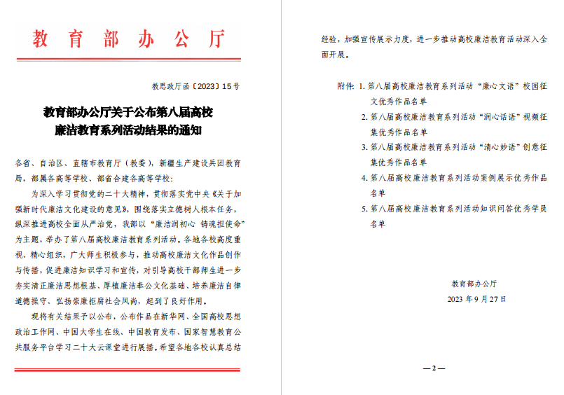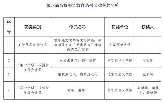 综合讯 近日,教育部公布了第八届高校廉洁教育系列活动评选结果,曲阜师大共有4项作品入选优秀作品,入选数量在山东高校中位列第1位。其中,选送的作品《儒家廉文化的转化与赋能:华体会官方网页版_华体会(中国)“五廉五力”廉洁教育工作案例》入选案例展示优秀作品;马克思主义学院张新越同学的《倡敬廉之风,践崇洁之行》、王晓帆同学的《写给未来自己的一封信》入选“廉心文语”校园征文优秀作品;马克思主义学院郭新华、李馨宇、孔妍婷三位同学的《青年!清廉!》入选“润心话语”视频征集优秀作品。