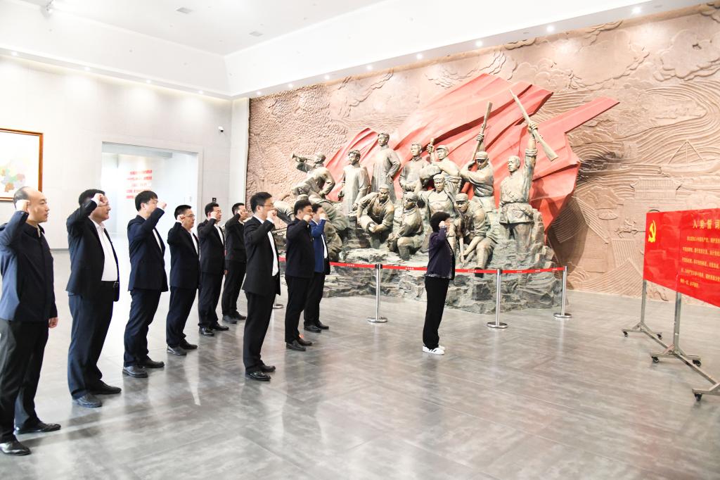 在纪念馆,全体党员在鲜红的党旗下庄严宣誓,重温入党誓词,坚定理想信念。学校党委书记邢光与郯城县委书记王立军共同为华体会官方网页版_华体会(中国)“大思政课”实践教学基地揭牌。