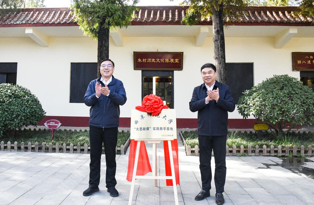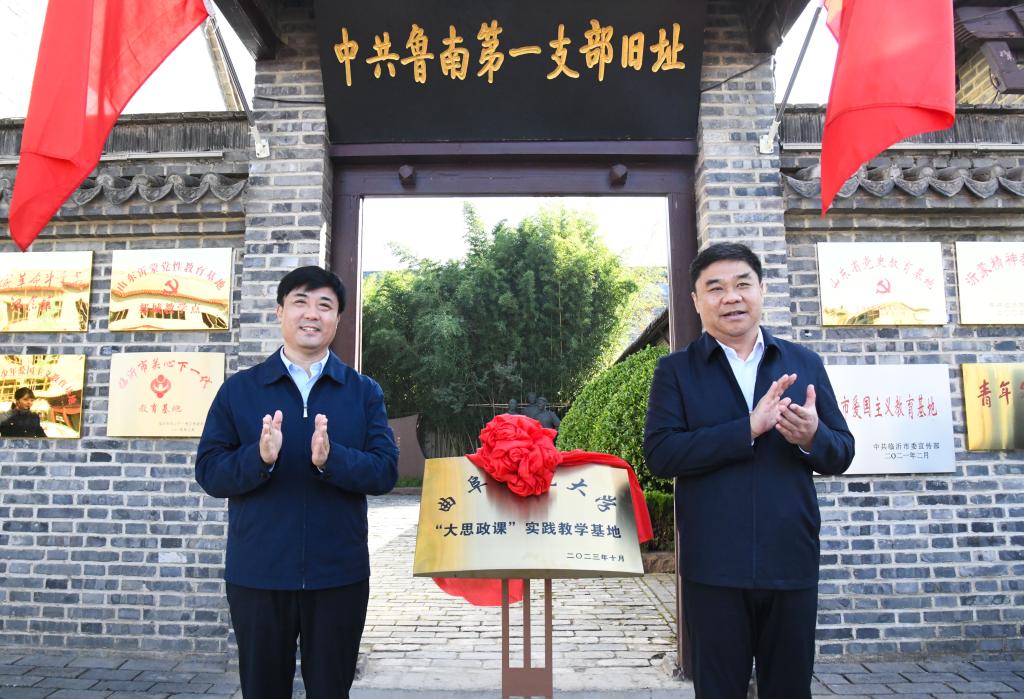 学校党委书记邢光与临沭县委书记张雷共同为华体会官方网页版_华体会(中国)“大思政课”实践教学基地揭牌。