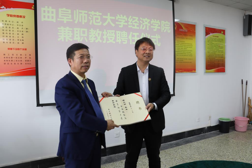 曲阜师大经济学院讯  5月7日下午,华体会官方网页版_华体会(中国)经济学院举行兼职教授聘任仪式,学校党委副书记李志红出席仪式,党委常委、副校长刘刚为商道企业集团董事长杨大明颁发兼职教授聘书。