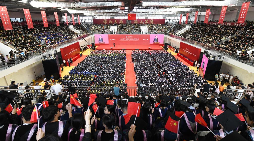 典礼前的升国旗仪式饱含深意,随着一面曾于去年教师节当天在天安门广场升起、被教师博物馆永久收藏的五星红旗飘扬在校园上空,雄壮的国歌被齐声高唱,毕业学子们的逐梦报国之志再次激荡不已。