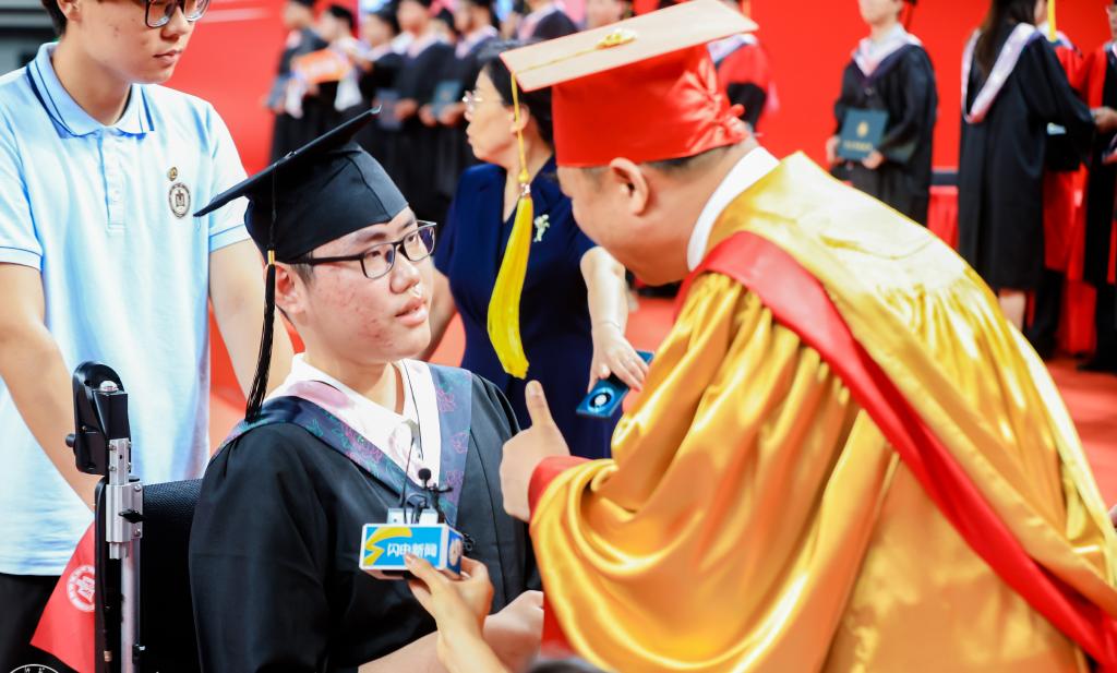 随着老师们开始为全体毕业生逐一拨穗正冠、授予学位证书,这场青春盛宴被推向高潮。此时,一位坐在轮椅上的毕业生引发了典礼上的感人一幕,学校党委书记邢光看到这位学子后,不待其上前就立即从主席台上迈下来,俯下身子和这位学生亲切交流并为他拨穗正冠。