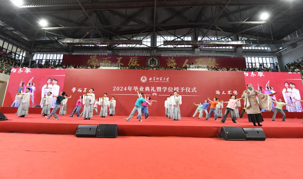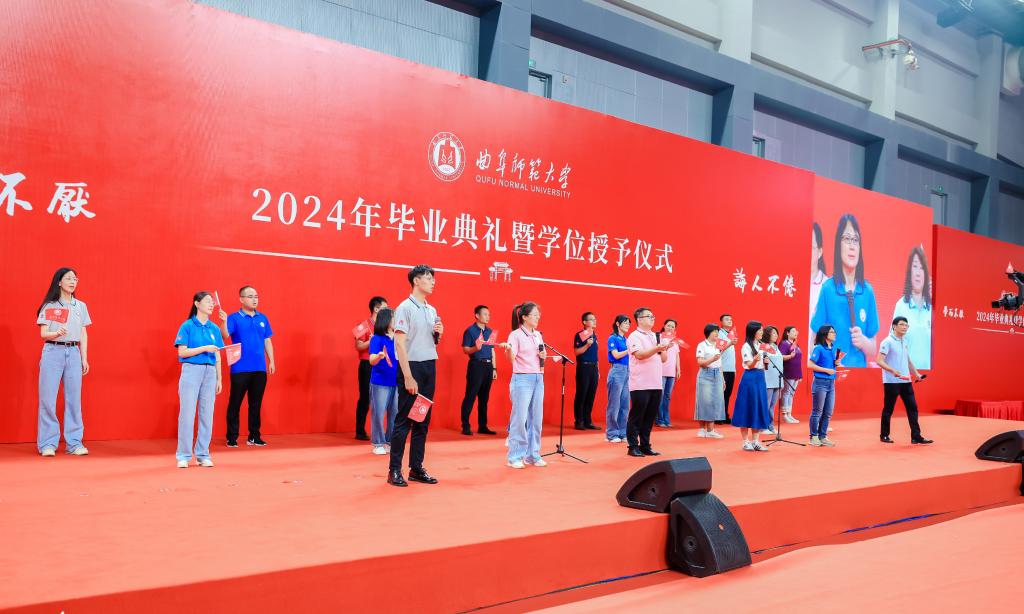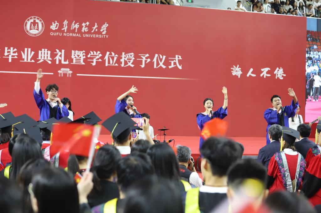 典礼上,精心编排的节目表演为毕业学子送上视听大礼,迅速拉升现场氛围、拨动青春心弦。舞蹈《杏坛弦歌》再现孔子教化的精髓,激发着孔子家乡大学师生矢志为国弘文的使命担当,国风歌曲串烧带着大家重温了美好青春韵律,原创歌曲《再见曲园》诠释出同学们对母校的爱与不舍,经典旋律《我爱你中国》唱出了毕业学子的赤热爱国之情。全场合唱校歌、传递校旗的环节,让同学们在浓浓的仪式感中再次拉满曲园人的荣誉感。