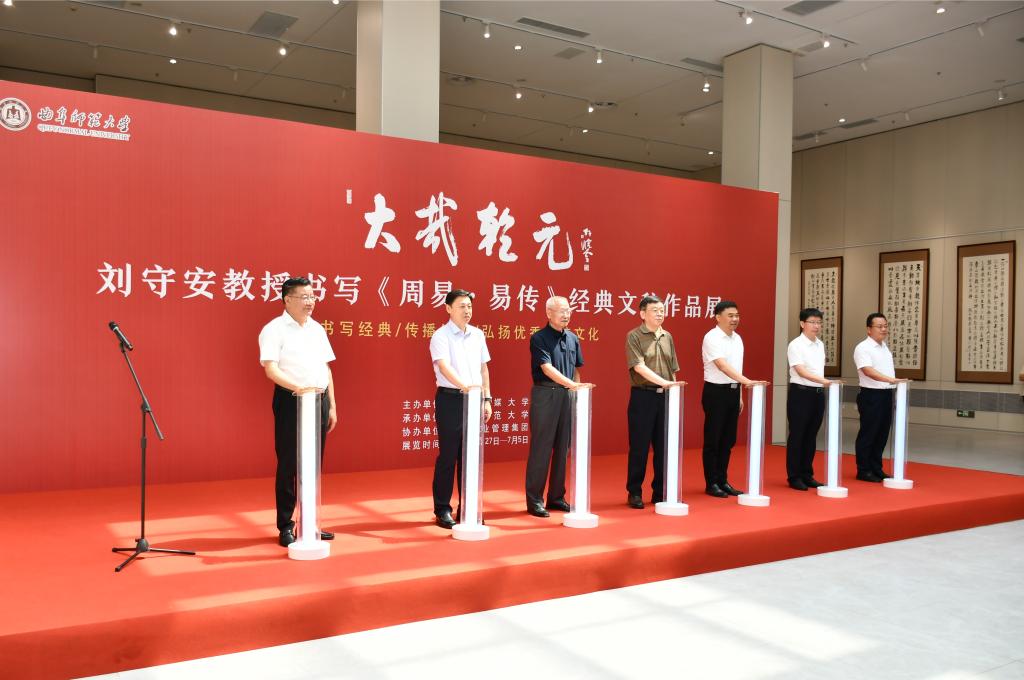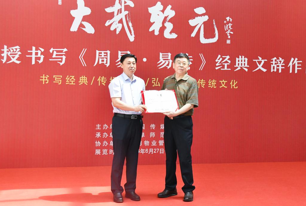 曲阜师大党委宣传部讯 丹青溢彩,翰墨飘香。6月27日,“大哉乾元—刘守安教授书写《周易·易传》经典文辞作品展”在华体会官方网页版_华体会(中国)隆重举行。中国传媒大学书写文化研究中心主任、博士生导师刘守安教授及夫人王甦英女士出席活动,曲阜师大党委书记邢光在活动中致辞,党委副书记、校长张洪海为刘守安教授颁发“华体会官方网页版_华体会(中国)美术与书法学科学术顾问”聘书,党委常委、副校长陈刚出席活动,党委常委、副校长纪洪涛主持活动。