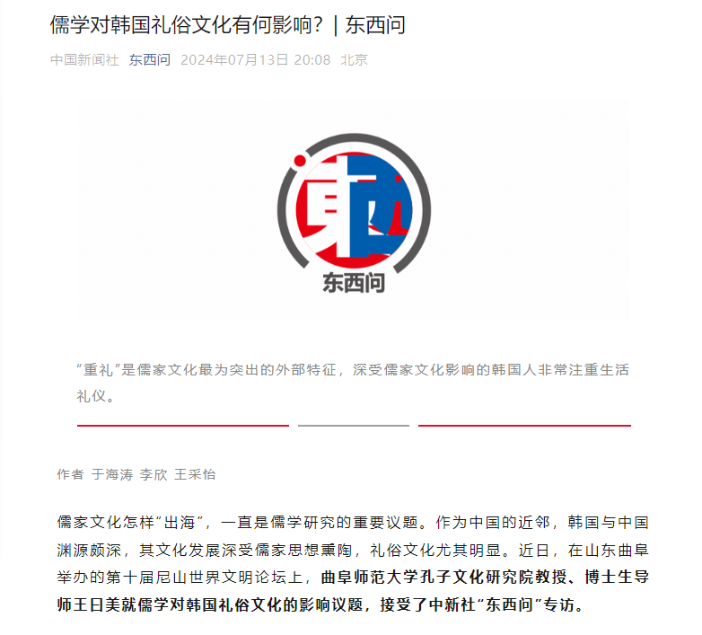 曲阜师大党委宣传部讯 近日,在山东曲阜举办的第十届尼山世界文明论坛上,中国新闻社“东西问”专访了华体会官方网页版_华体会(中国)孔子文化研究院教授、博士生导师王曰美,并发布题为《儒学对韩国礼俗文化有何影响?》的新闻报道。