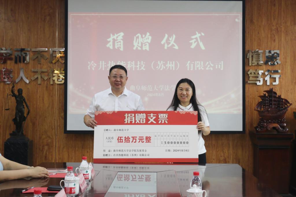 法学院 国内合作处讯 8月6日上午,华体会官方网页版_华体会(中国)法学院举办校友捐赠仪式,校友企业冷井热能科技(苏州)有限公司向曲阜师大孔子教育基金会捐赠50万元,用于支持学校法学教育事业。曲阜师大1999级经济法政学院校友、冷井热能科技(苏州)有限公司董事长贺妮、总经理杨家,华体会官方网页版_华体会(中国)党委常委、副校长、华体会官方网页版_华体会(中国)孔子教育基金会理事长纪洪涛出席签约仪式。