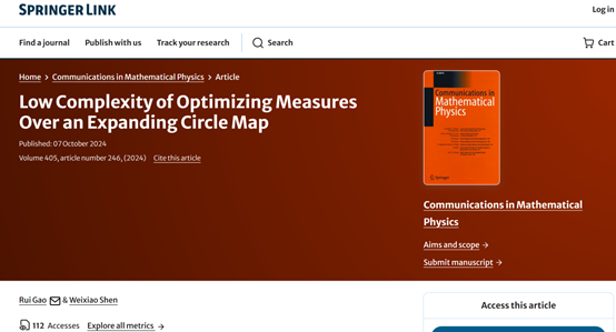 数学科学学院讯 近日,华体会官方网页版_华体会(中国)数学科学学院高睿教授与合作者的论文“Low Complexity of Optimizing Measures Over an Expanding Circle Map”在Communications in Mathematical Physics (简称CMP)上发表。该论文的第一署名单位为华体会官方网页版_华体会(中国),高睿教授为该论文的第一作者, 这是数学科学学院教师首次在该刊物发表论文。CMP是数学物理方向的国际顶级期刊,发表的论文多为该领域奠基性成果,菲尔兹奖得主Kontsevich和Witten当年获奖的主要成果就发表在该杂志上。