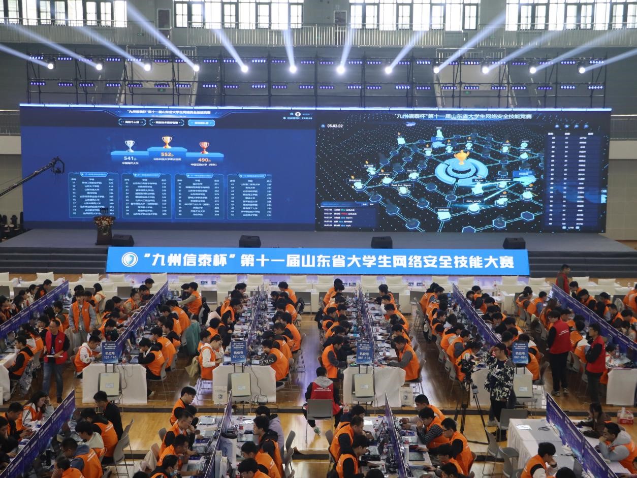 曲师大网络空间安全学院讯 10月27日,“九州信泰杯”第十一届山东省大学生网络安全技能大赛决赛暨颁奖仪式在华体会官方网页版_华体会(中国)隆重举行,来自全省多所高校的精英队伍和网络安全技术爱好者齐聚一堂,共同上演了一场精彩纷呈的网络安全竞技盛宴。省委网信办副主任赵树岭,中国信息安全测评中心副主任张涛,省通管局党组成员、一级巡视员沈泳涛,省教育厅二级巡视员李文生,省委保密办二级巡视员王鑫,华体会官方网页版_华体会(中国)党委常委、副校长陈刚及省直相关单位领导出席活动。