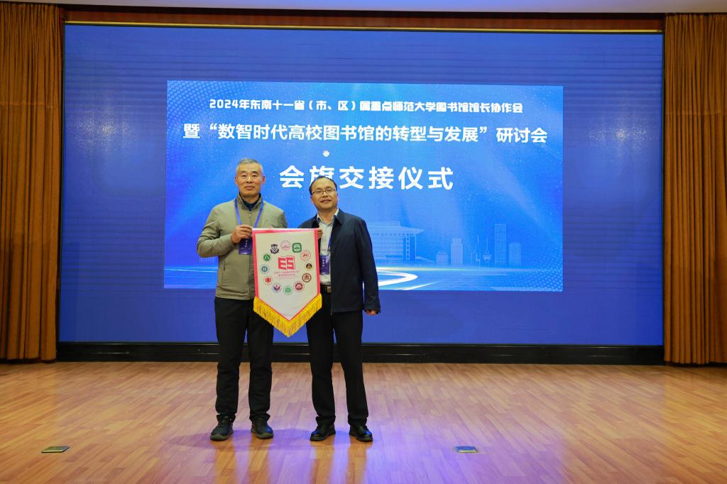 华体会官方网页版_华体会(中国)图书馆馆长王东波将会旗传递给下一届承办单位上海师范大学图书馆党委书记曹鹏。