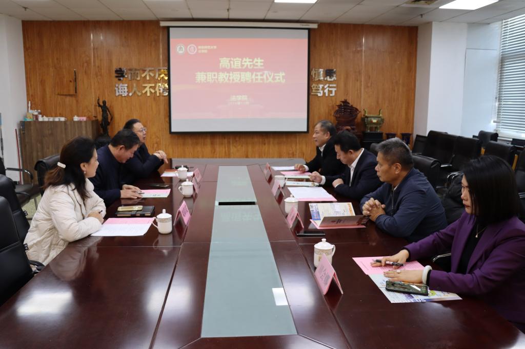 高谊对受聘兼职教授深感荣幸,并表示在今后的工作中,将紧密结合学校的工作要求与实际需要,积极投入到学院的教学、科研工作中,为助推法学院各项事业高质量发展贡献力量。