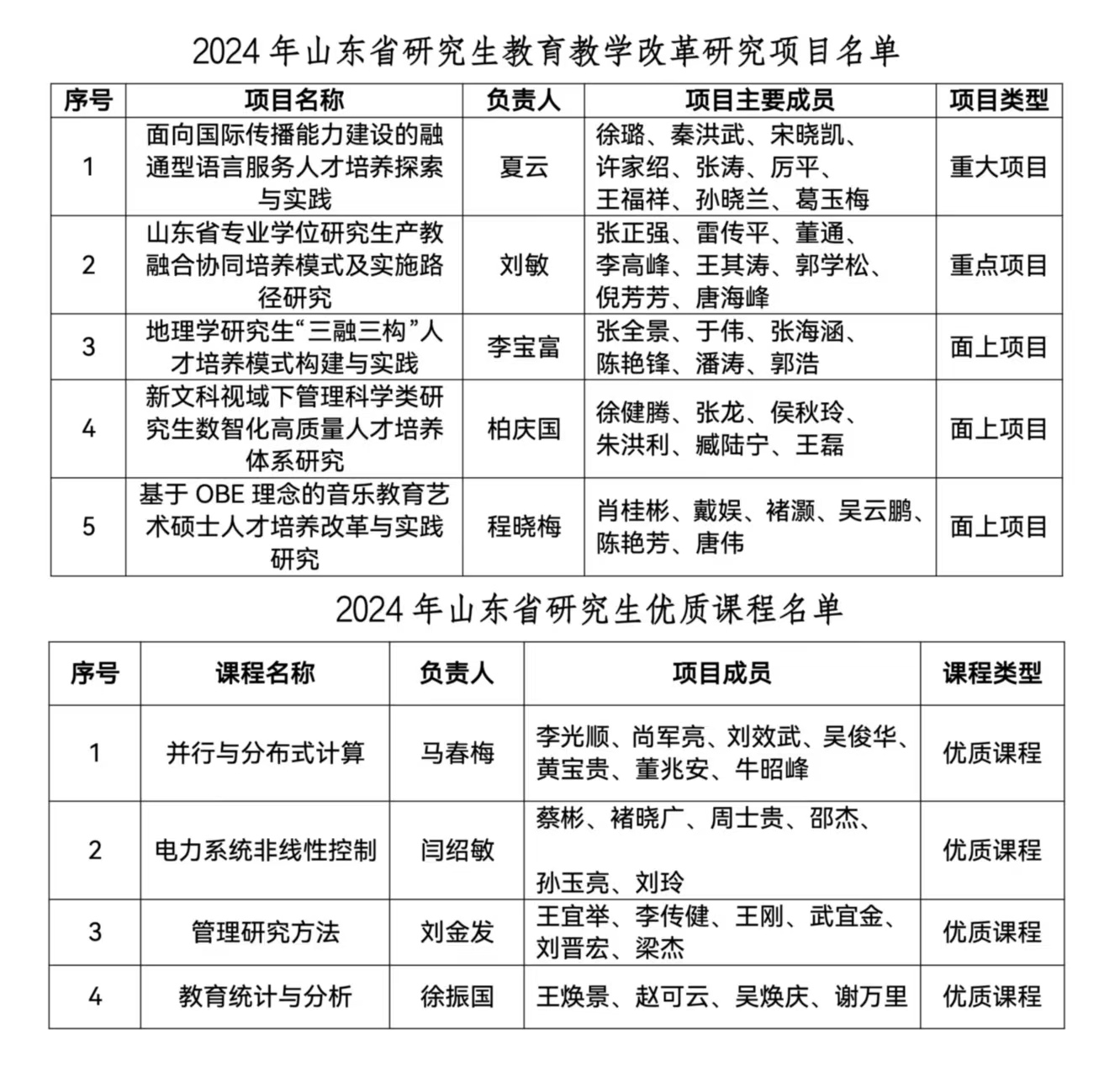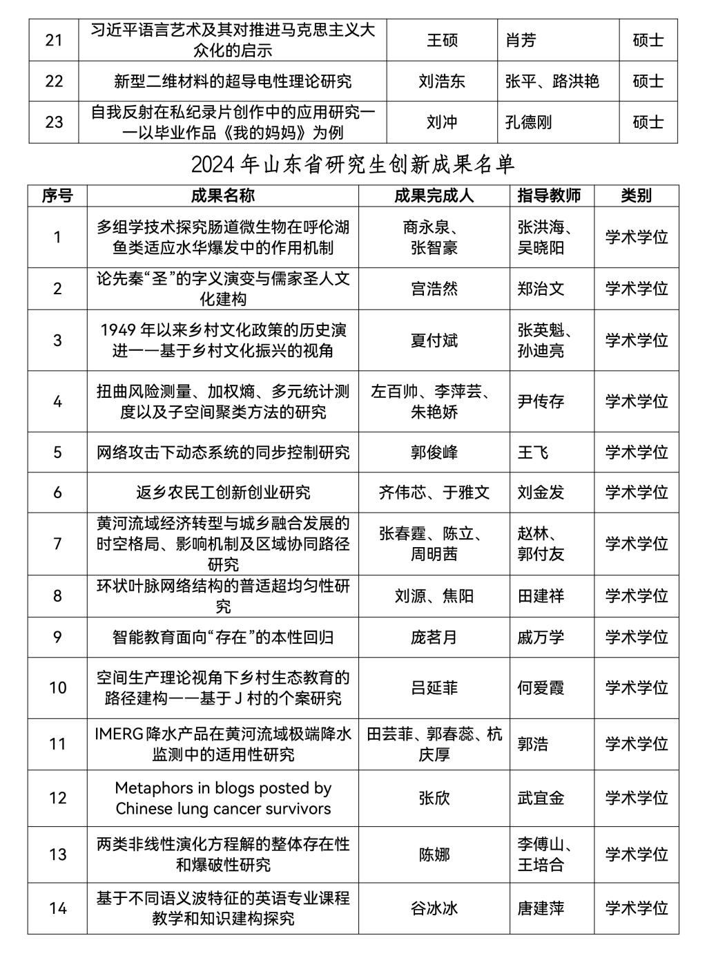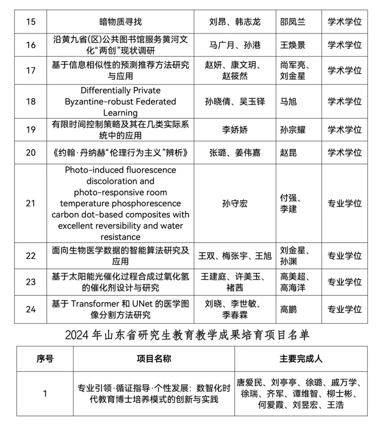 研究生处讯 近日,山东省教育厅公布了2024年研究生教育教学资源建设相关项目评审结果,曲阜师大共有73项获奖,其中教育教学成果培育项目1项、教育教学改革研究项目5项、优质课程9项、精品和优质专业学位教学案例库11项、优秀博士、硕士学位论文23项、创新成果24项,涵盖了研究生培养模式改革与创新、专业学位研究生培养、课程建设、研究生教育教学管理改革和研究生思想政治教育等类别。
