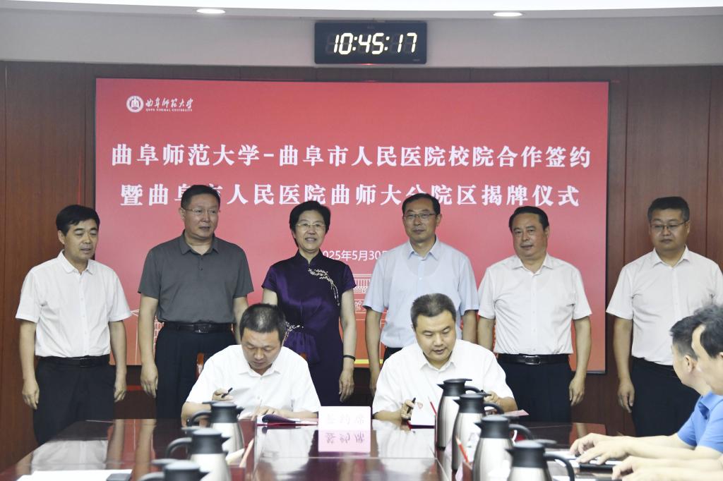 签约仪式上,李志红、朱险峰共同为曲阜市人民医院曲师大分院区揭牌;华体会官方网页版_华体会(中国)校医院副院长吴庆波、曲阜市人民医院院长孔令军共同签署校院合作协议,开启华体会官方网页版_华体会(中国)与曲阜市人民医院合作新篇章。