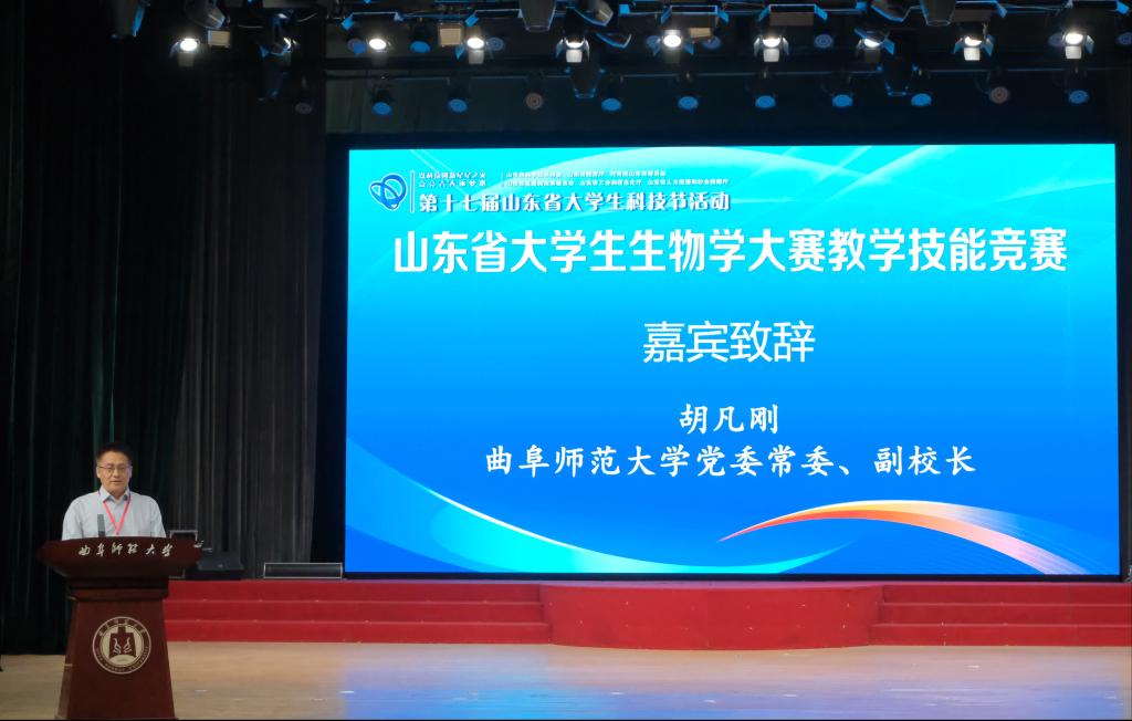 胡凡刚致辞中向参会的领导、专家及参赛师生表示欢迎,介绍了学校和生命科学学院的发展近况。他表示,本次大赛是山东省大学生科技节的重要组成部分,也是山东省高校生物学专业领域的一项重大赛事,为生物学专业学生锤炼教学技能提供了竞技舞台,也为省内高校生物学专业人才培养提供了交流的机会。学校将全力以赴,认真做好大赛的组织和服务保障工作,确保赛事有序开展,同时期待通过这次比赛进一步加强与各兄弟院校的交流与合作,携手培育大国良师,共同推动师范教育发展。