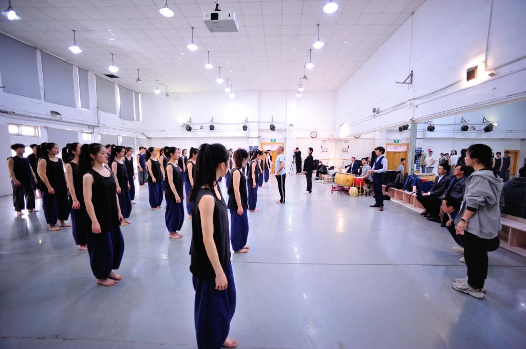 交流结束后,迪诺•维尔加在音乐学院实训室进行现场舞蹈教学,迪•马约教授现场鼓乐伴奏。迪诺•维尔加教授向在场的大三、大四本科生以及研究生们介绍了坎宁汉技术,从基本动作训练到组合练习,为在场师生呈现了一场精彩的舞蹈大师课。