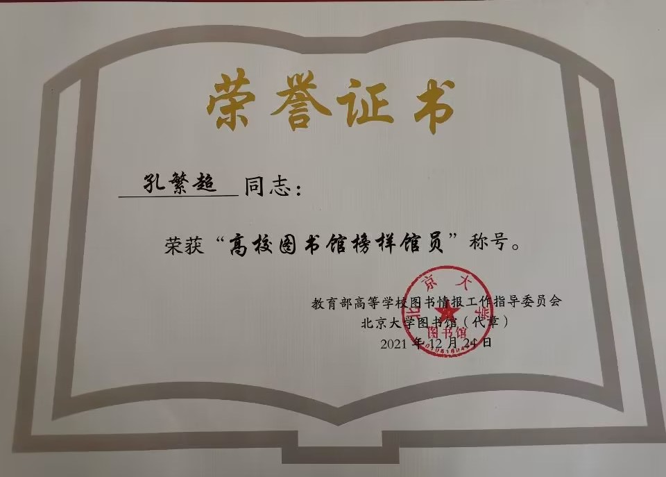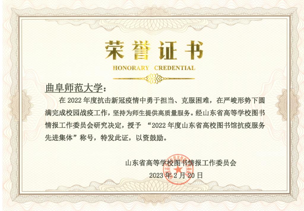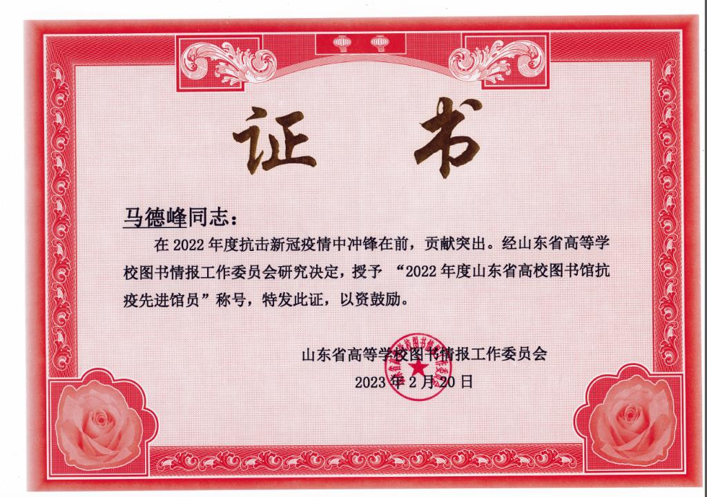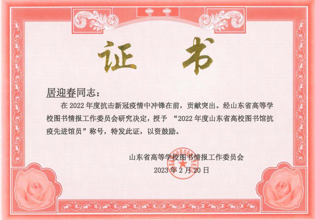 大会对2022年度各项先进工作进行了表彰,曲阜师大图书馆荣获“2022年度山东省高校图书馆抗疫服务先进集体”称号,研究馆员孔繁超老师荣获“全国高校图书馆榜样馆员”,居迎春、马德峰两位老师分别荣获“2022年度山东省高校图书馆抗疫先进馆员”,由任丹凤、韩梅花等报送的“以赛弘道,以文化人”文化达人挑战赛服务创新案例荣获“知网杯”山东省高校图书馆能力大赛三等奖。