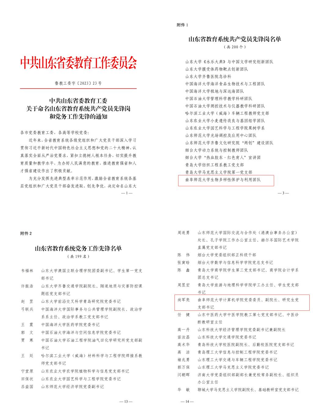 曲阜师大党委组织部讯 近日,学校基层党组织和党员队伍在上级各类评选表彰中再获得多项荣誉。生命科学学院王仁君率领的生物多样性保护与利用团队,获评“全省教育系统共产党员先锋岗”;计算机学院尚军...