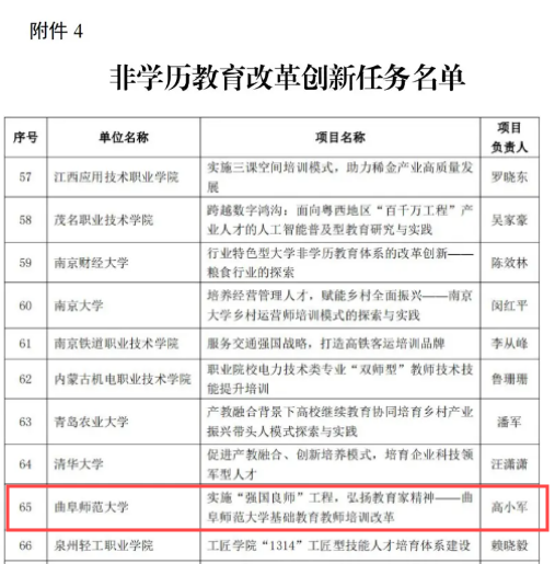 继续教育学院讯 近日,教育部发布了《2024 年学习型社会建设重点任务(高等继续教育领域)培育建设名单》,曲阜师大继续教育学院高小军副教授的《实施“强国良师”工程,弘扬教育家精神——华体会官方网页版_华体会(中国)...